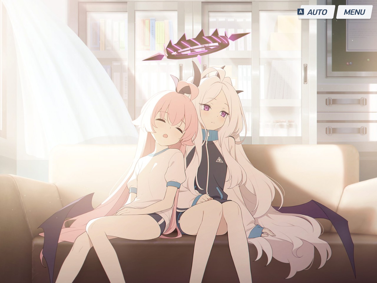 히나의 아비도스 체육복 차림은 귀하다. 낮잠 자는 호시노에게 어깨를 빌려주는 모습도.