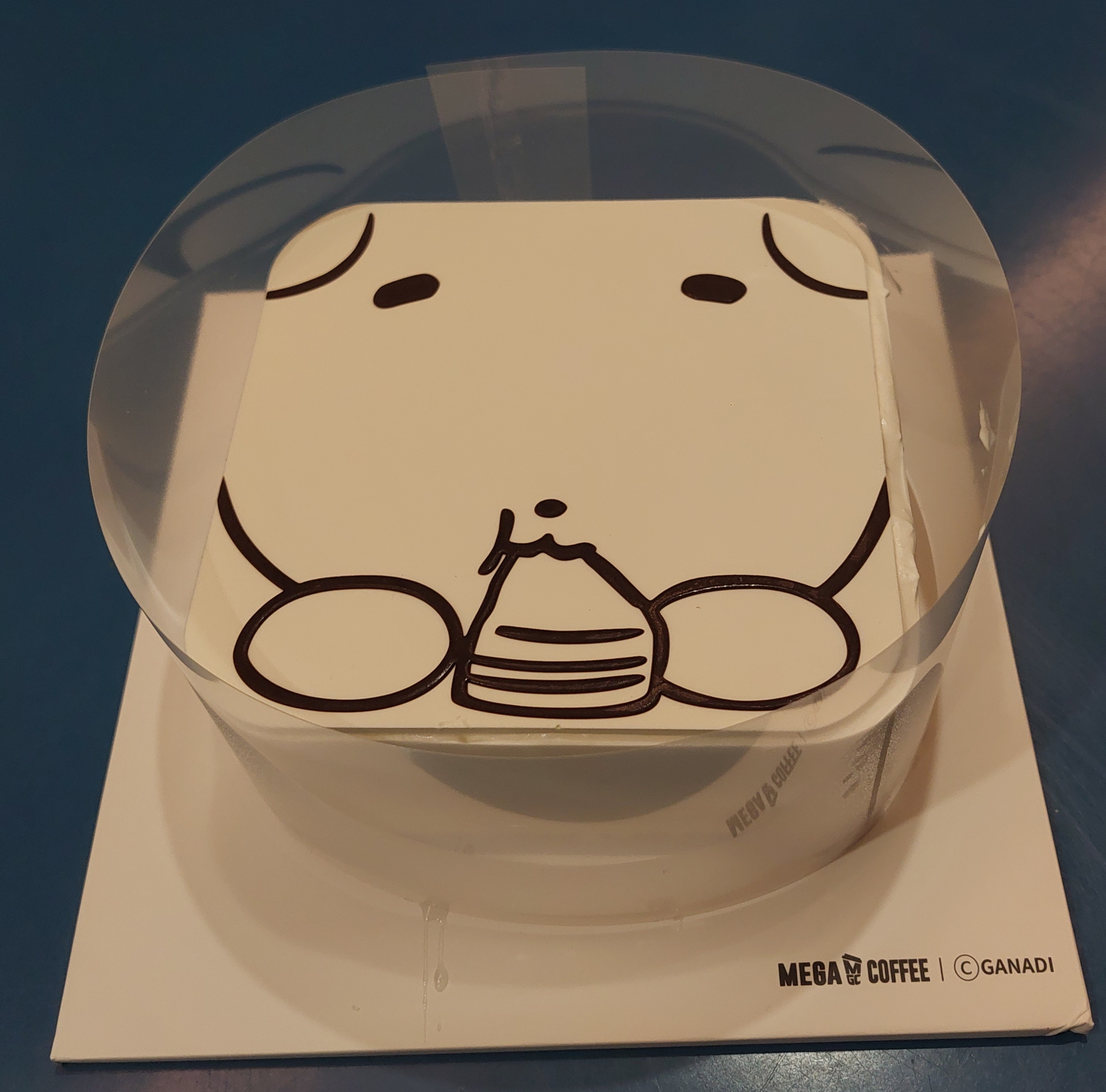 가나디라는 캐릭터를 좋아하는 여자친구가, 키링도 받을 겸, 데이트 때 같이 먹을 겸해서 메가커피에서 예약 주문해 둔 쿠앤크 케이크다.