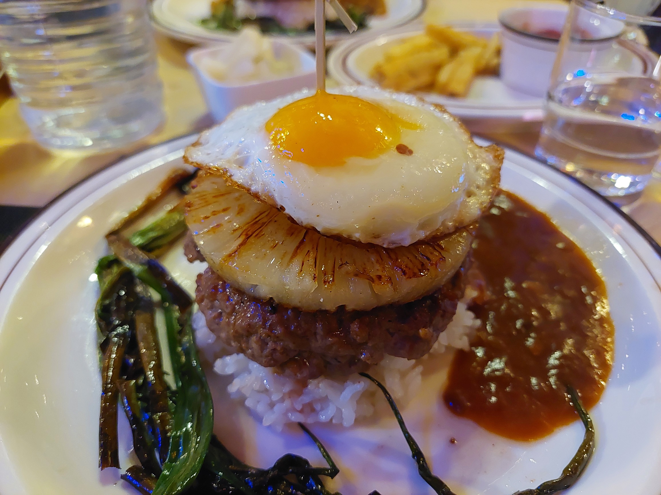 일단 기본적으로 서니사이드업 달걀 프라이가 올라가고, 그 아래에 구운 양파와 파인애플이 있고, 햄버그 스테이크 본체 아래에 밥이 있다.